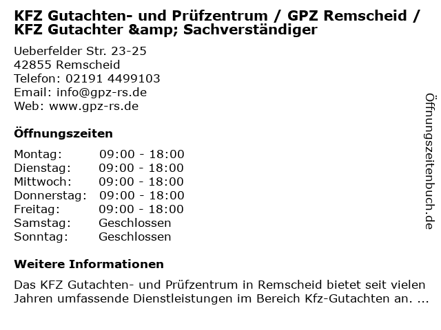 Branchen & Suchbegriffe zu KFZ Gutachten- und Prüfzentrum / GPZ Remscheid / KFZ Gutachter & Sachverständiger:gpz, gutachten, gutachter, kfz, prüfzentrum, sachverständiger |