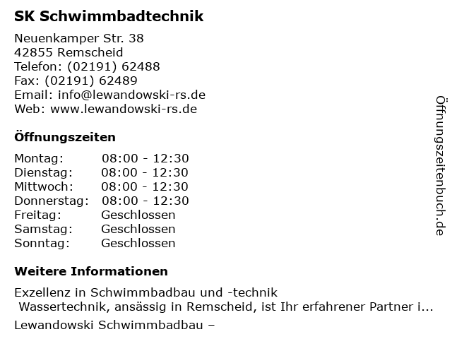 | Öffnungszeiten SK Schwimmbadtechnik in Remscheid anzeigen | |