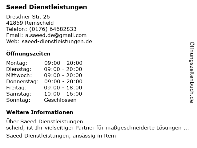 | Öffnungszeiten Saeed Dienstleistungen in Remscheid anzeigen | |