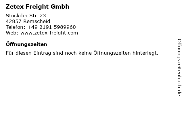 | Öffnungszeiten Zetex Freight Gmbh in Remscheid anzeigen | |