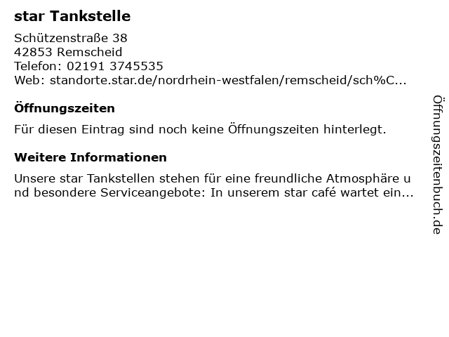 | Öffnungszeiten star Tankstelle in Remscheid anzeigen | |