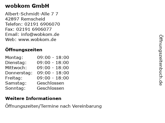 | Öffnungszeiten wobkom GmbH in Remscheid anzeigen | |