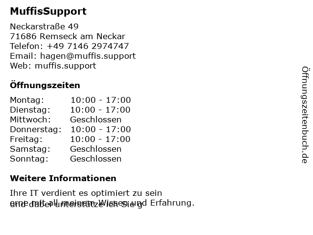 | Öffnungszeiten MuffisSupport in Remseck am Neckar anzeigen | |
