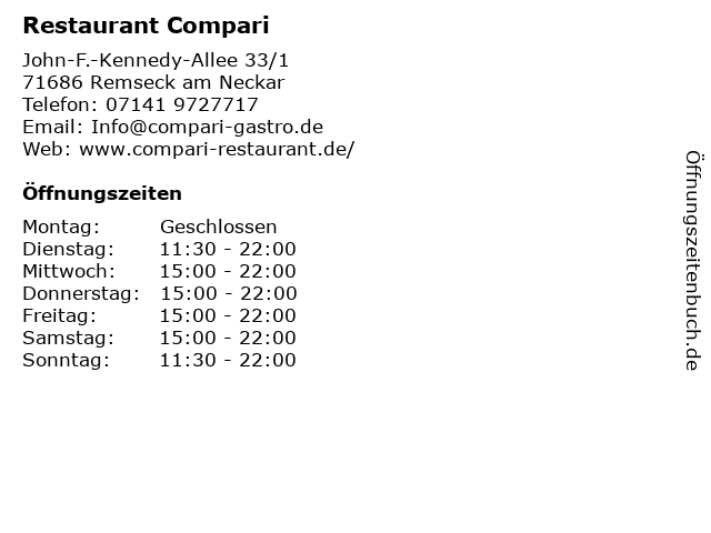 | Öffnungszeiten Restaurant Compari in Remseck am Neckar anzeigen | |