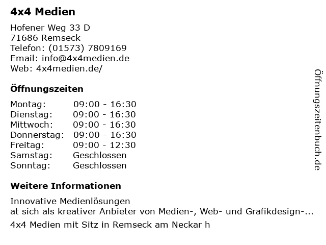 | Öffnungszeiten 4x4 Medien in Remseck anzeigen | |