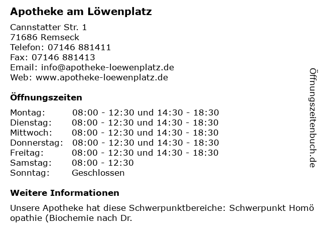 | Öffnungszeiten Apotheke am Löwenplatz in Remseck anzeigen | |