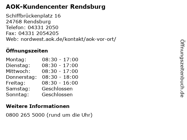 | Öffnungszeiten AOK-Kundencenter Rendsburg in Rendsburg anzeigen | |