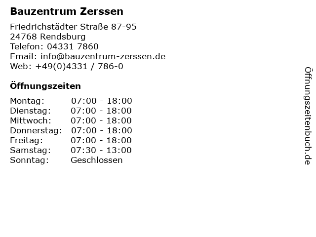 | Öffnungszeiten Bauzentrum Zerssen in Rendsburg anzeigen | |
