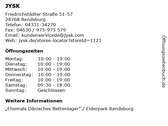 | Öffnungszeiten JYSK in Rendsburg anzeigen | |