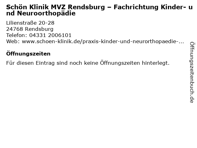 | Schön Klinik MVZ Rendsburg – Fachrichtung Kinder- und Neuroorthopädie anrufen | |
