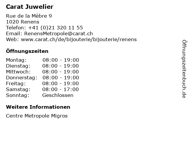| Öffnungszeiten Carat Juwelier in Renens anzeigen | |