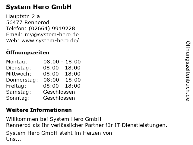 | Öffnungszeiten System Hero GmbH in Rennerod anzeigen | |