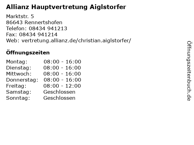 1 Allianz Versicherung Horst Fuchs Hauptvertretung (Entfernung: 19,27 km) Augsburger Straße 17 a, 86668 Karlshuld 2 Manfred Aiglstorfer Unternehmensberatung (Entfernung: 24,30 km) Nördliche Ringstr. 13, 85080 Gaimersheim 4 Norbert Raab Zürich Versicherung Generalagentur (Entfernung: 0,15 km) Marktstr. 16, 86643 Rennertshofen 5 Generali Versicherungen - Josef Empl Generalagentur (Entfernung: 16,84 km) Marktplatz 8, 86653 Monheim 6 Gothaer Versicherung - Generalagentur Torsten Seiverth (Entfernung: 24,21 km) Aufeldstr. 2, 85051 Ingolstadt |