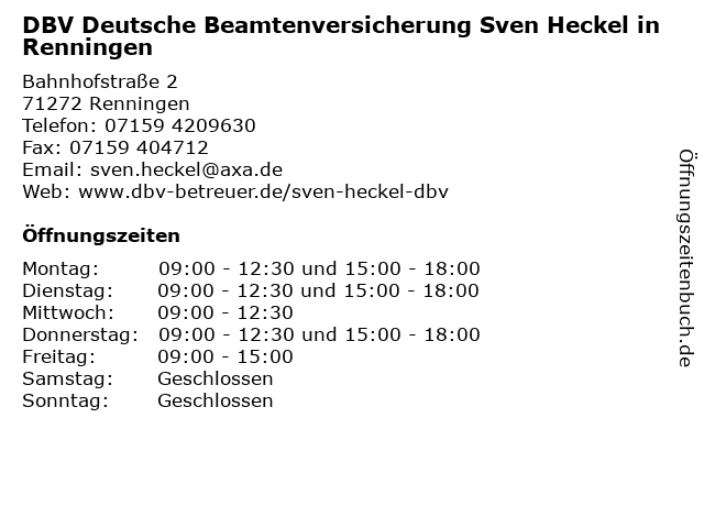 Branchen & Suchbegriffe zu DBV Deutsche Beamtenversicherung Sven Heckel in Renningen:autoversicherung, beamtenversicherung, berufshaftpflichtversicherung, dbv, deutsche, gebäude- und hausratsversicherung, heckel, lebensversicherung, sven, unternehmen für versicherungsfachfragen, zahnmedizinische versicherung |