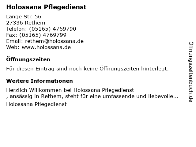 | Öffnungszeiten Holossana Pflegedienst in Rethem anzeigen | |
