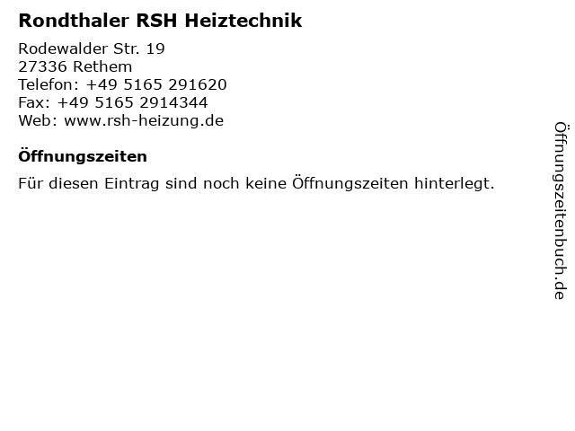 | Öffnungszeiten Rondthaler RSH Heiztechnik in Rethem anzeigen | |