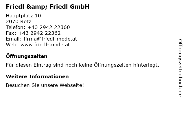 | Öffnungszeiten Friedl & Friedl GmbH in Retz anzeigen | |