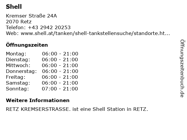 | Öffnungszeiten Shell in Retz anzeigen | |