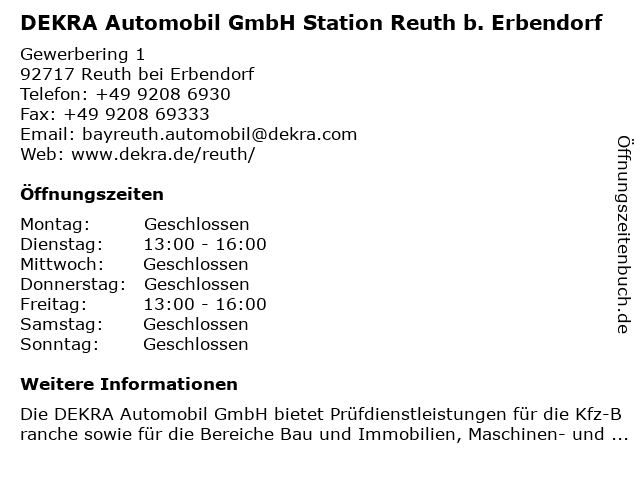 2 DEKRA Automobil GmbH Station Tirschenreuth (Entfernung: 14,51 km) Otto-Hahn-Straße 1, 95643 Tirschenreuth 4 A.T.U Marktredwitz Hauptuntersuchung Dekra (Entfernung: 18,38 km) Wölsauer Straße 20a, 95615 Marktredwitz 6 |
