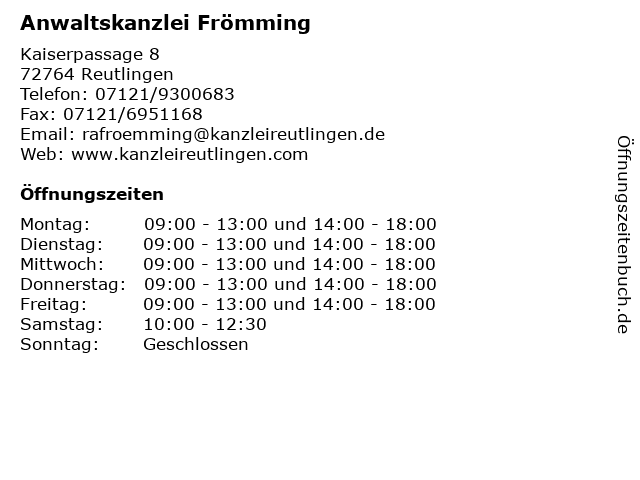 | Öffnungszeiten Anwaltskanzlei Frömming in Reutlingen anzeigen | |