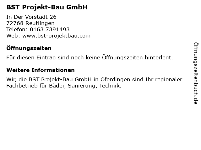 | Öffnungszeiten BST Projekt-Bau GmbH in Reutlingen anzeigen | |