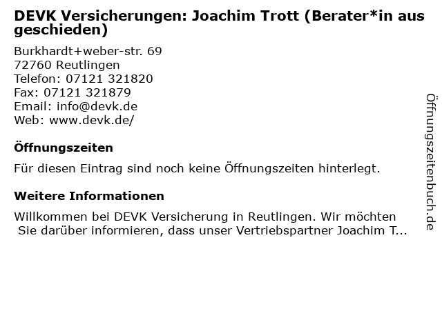 | DEVK Versicherungen: Joachim Trott (Berater*in ausgeschieden) anrufen | |