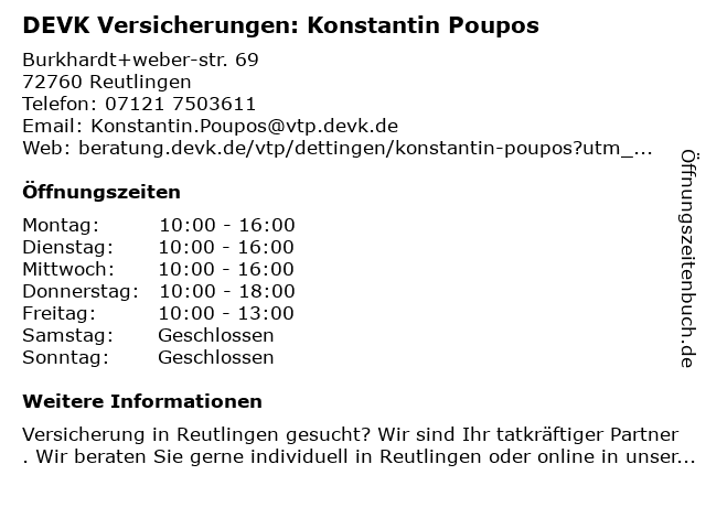 1 DEVK Versicherungen: Joachim Trott (Berater*in ausgeschieden) (Entfernung: 0,00 km) Burkhardt+weber-str. 69, 72760 Reutlingen 3 DEVK Versicherung Nikolaos Poupos Gebietsleiter (Entfernung: 0,01 km) Burkhardt-und-Weber-Straße 69, 72760 Reutlingen 6 |
