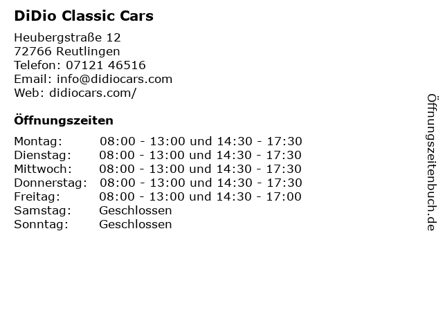 | Öffnungszeiten DiDio Classic Cars in Reutlingen anzeigen | |