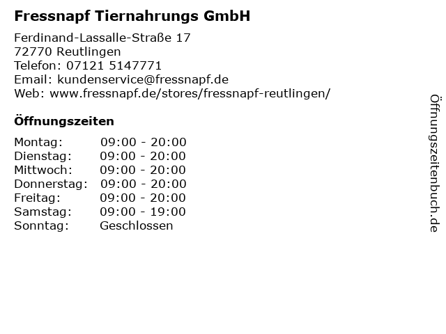1 Hundesalon Tier-Mobil im Fressnapf Reutlingen (Entfernung: 0,02 km) Ferdinand-Lassalle-Straße 17-19, 72770 Reutlingen-Betzingen 6 Fressnapf Filiale Neckartenzlingen Haustierbedarfsgeschäft (Entfernung: 11,51 km) Robert-Bosch-Str. 3, 72654 Neckartenzlingen |