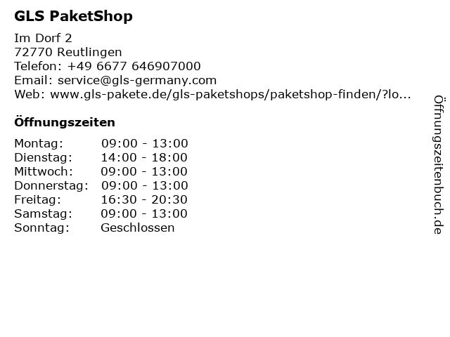 | Öffnungszeiten GLS PaketShop in Reutlingen anzeigen | |
