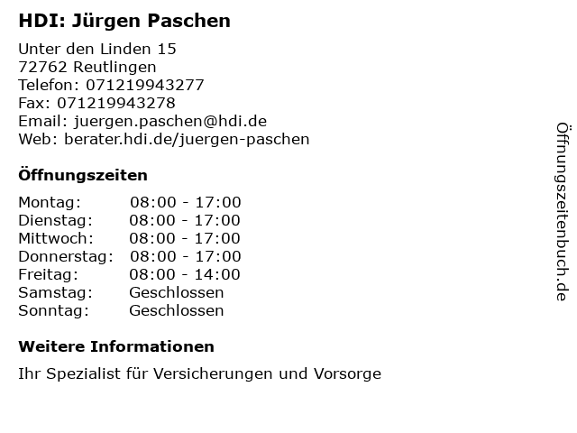 | Öffnungszeiten HDI: Jürgen Paschen in Reutlingen anzeigen | |