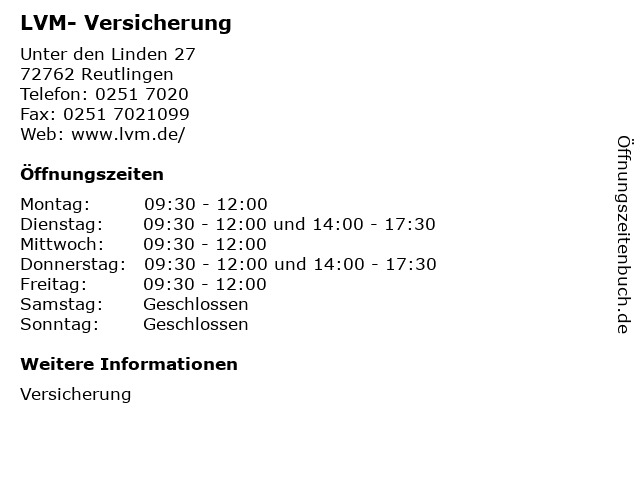 | Öffnungszeiten LVM- Versicherung in Reutlingen anzeigen | |