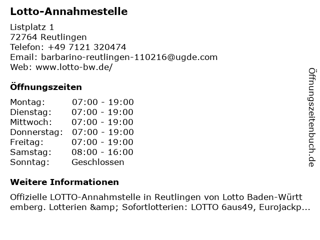 | Öffnungszeiten Lotto-Annahmestelle in Reutlingen anzeigen | |