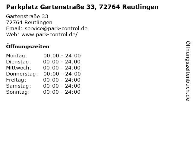 | Öffnungszeiten Parkplatz Gartenstraße 33, 72764 Reutlingen in Reutlingen anzeigen | |