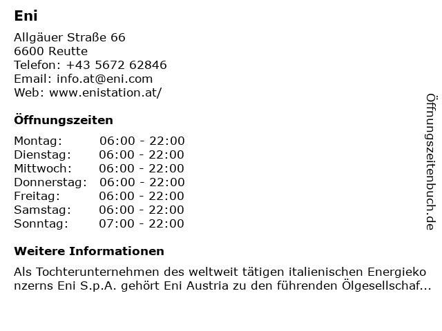 | Öffnungszeiten Eni in Reutte anzeigen | |