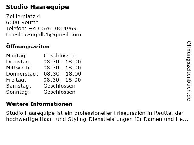 | Öffnungszeiten Studio Haarequipe in Reutte anzeigen | |