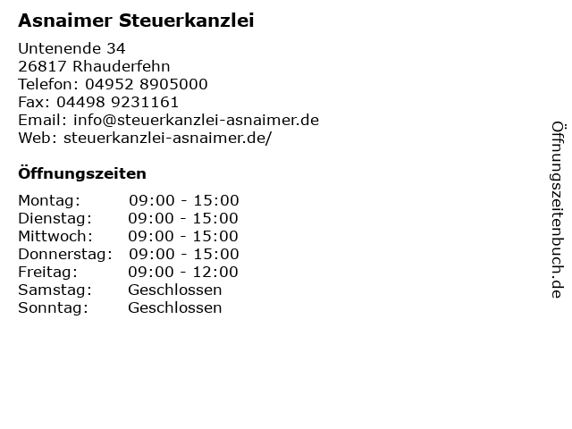 | Öffnungszeiten Asnaimer Steuerkanzlei in Rhauderfehn anzeigen | |