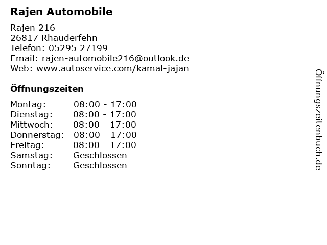 | Öffnungszeiten Rajen Automobile in Rhauderfehn anzeigen | |