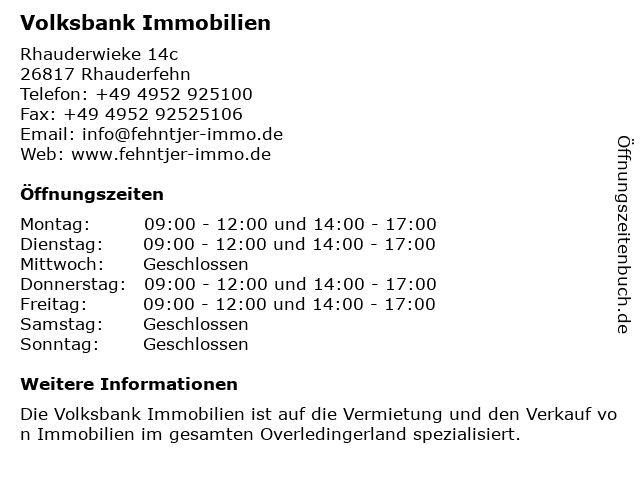 | Öffnungszeiten Volksbank Immobilien in Rhauderfehn anzeigen | |
