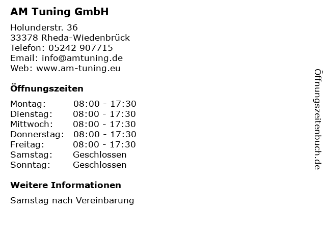 | Öffnungszeiten AM Tuning GmbH in Rheda-Wiedenbrück anzeigen | |