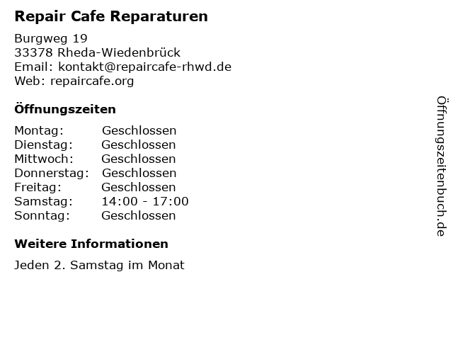 | Öffnungszeiten Repair Cafe Reparaturen in Rheda-Wiedenbrück anzeigen | |