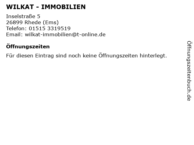 | Öffnungszeiten WILKAT - IMMOBILIEN in Rhede (Ems) anzeigen | |