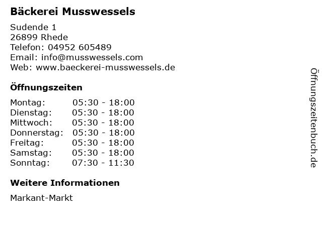 | Öffnungszeiten Bäckerei Musswessels in Rhede anzeigen | |