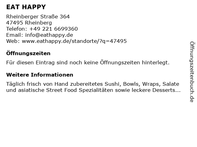 | Öffnungszeiten EAT HAPPY in Rheinberg anzeigen | |