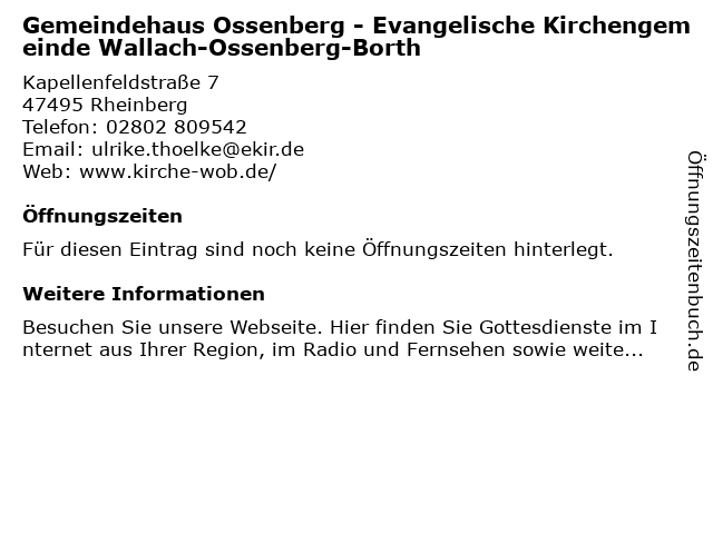 | Gemeindehaus Ossenberg - Evangelische Kirchengemeinde Wallach-Ossenberg-Borth anrufen | |