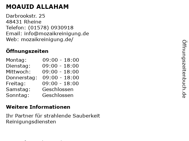 | Öffnungszeiten MOAUID ALLAHAM in Rheine anzeigen | |