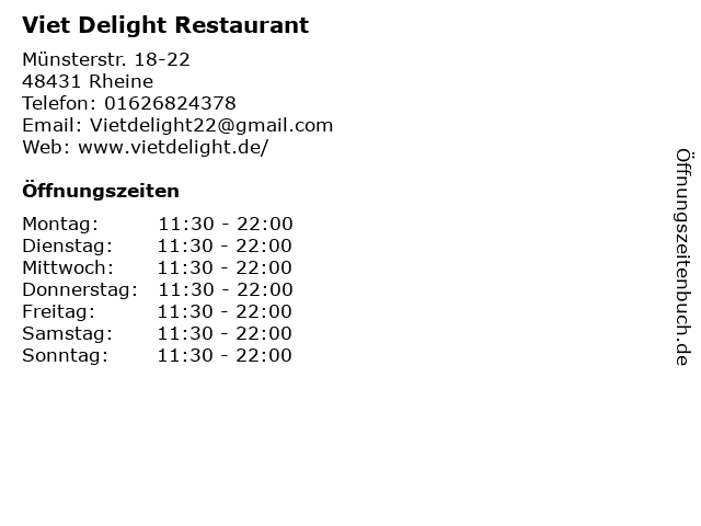 | Öffnungszeiten Viet Delight Restaurant in Rheine anzeigen | |