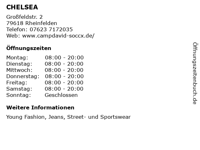 | Öffnungszeiten CHELSEA in Rheinfelden anzeigen | |