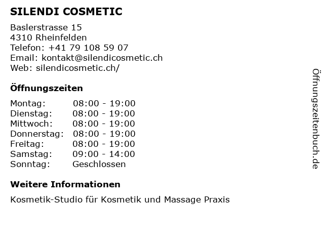 | Öffnungszeiten SILENDI COSMETIC in Rheinfelden anzeigen | |