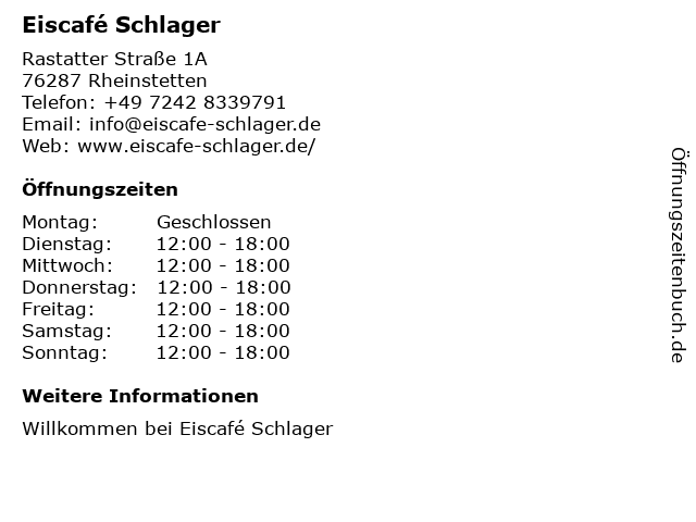 | Öffnungszeiten Eiscafé Schlager in Rheinstetten anzeigen | |